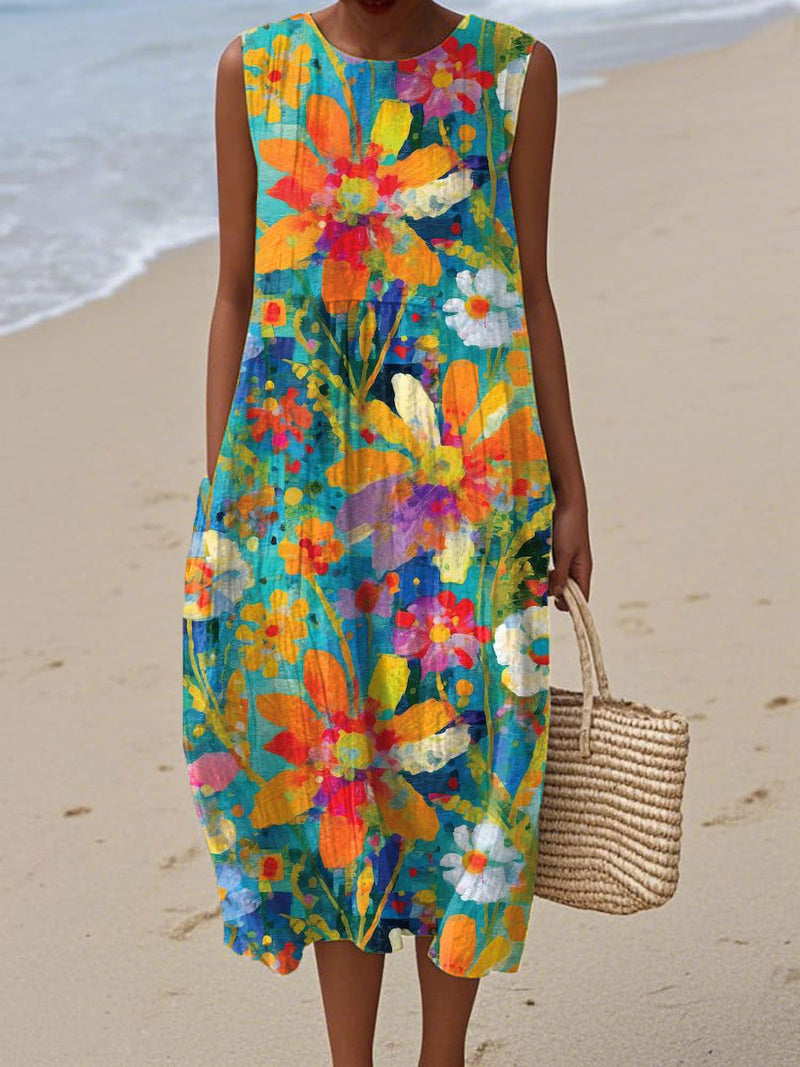 Damen Vintage Floral Art Print Fließendes Freizeitkleid