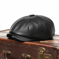 Eine Lederkappe, die Vintage-Charme mit zeitgenössischem Handwerk kombiniert. Ihre glatte Oberfläche und strukturierten Paneele schaffen einen mutigen, aber zeitlosen Look, perfekt für entspannte Ausflüge und elegante Stile.