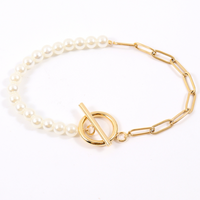 Gehalten von polierten Goldgliedern, präsentiert dieses außergewöhnliche Schmuckstück faszinierende Süßwasserperlen und einen kunstvoll gestalteten Knebelverschluss im Zentrum.